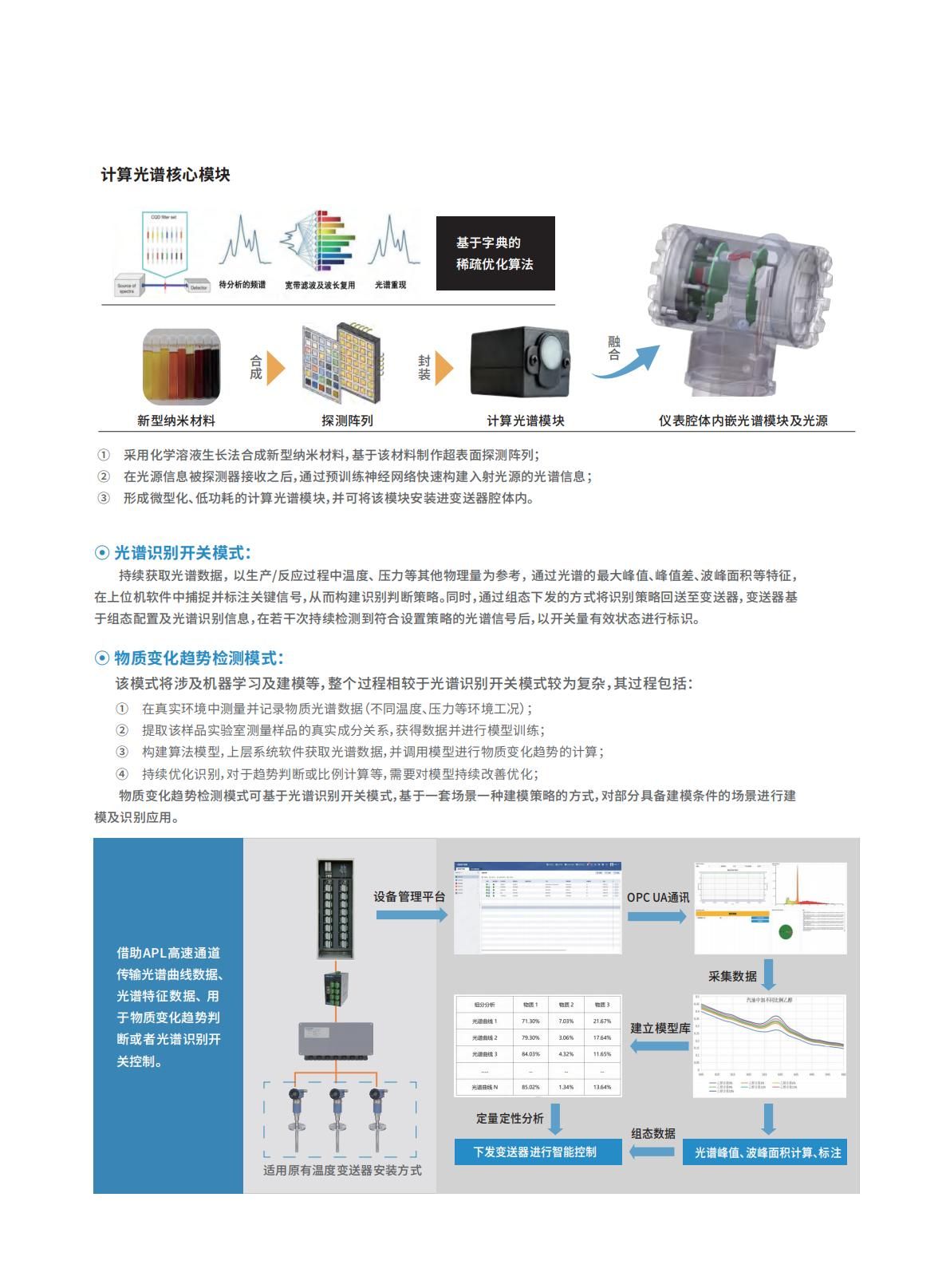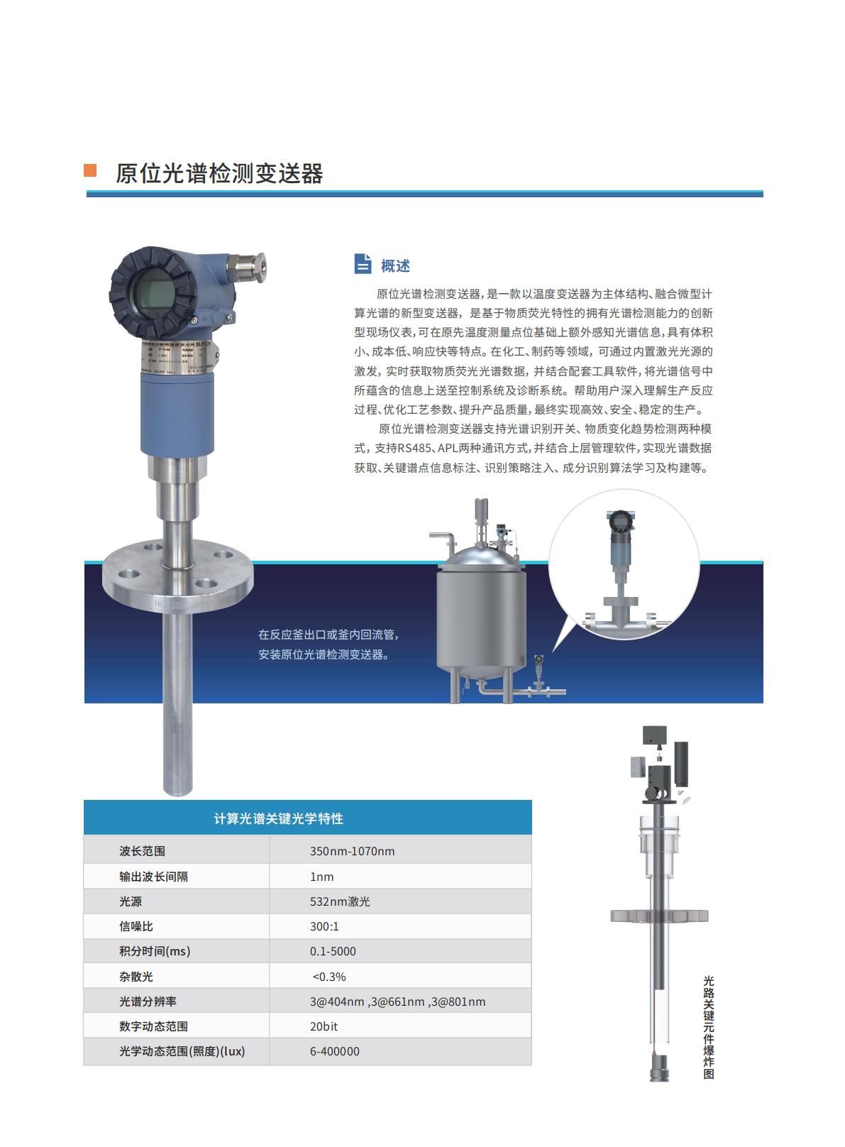 原位光譜檢測變送器,是一款以溫度變送器為主體結構、融合微型計(jì)算光譜的新型(xíng)變送器(qì), 是基於物質熒光特(tè)性的擁有光譜檢測(cè)能力(lì)的創新型(xíng)現場儀表,可在原先溫度測量點位基礎上額外感知光譜信息,具有體積小、成本低、響應(yīng)快等特點。 在化工、製藥等領域, 可通過內置激(jī)光光源的激發, 實時(shí)獲(huò)取物質熒(yíng)光光譜數據, 並結合配套工具軟件,將光譜信號(hào)中所蘊含的信息上送至控(kòng)製係統及診斷係(xì)統。 幫助用戶深入理解生產反應(yīng)過(guò)程、優化工藝參(cān)數(shù)、提升產品(pǐn)質量,最終實現高效、安全、穩定的生產。原位光譜檢(jiǎn)測變送器支持(chí)光譜識別開關、 物質變化趨勢檢測兩種模式, 支持RS485、APL兩種通訊方式,並結合上層管理軟件,實現(xiàn)光譜數據獲取、關鍵譜點信息標注、 識別策略注入、 成分識(shí)別算法學習及構建等。