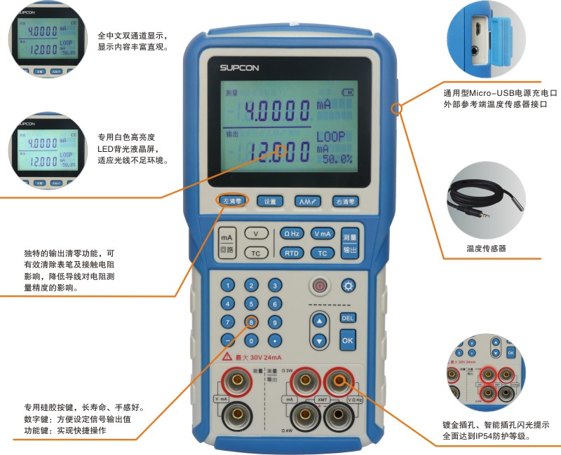 X係列過程校驗儀/校準器是一種高精度手持式(shì)信號測量/輸出儀表,能同時測量和輸出電壓、電流、電阻、頻率、熱電偶、熱電阻、脈衝等各種工業過程信號,其最高準確度為±0.01%FS。